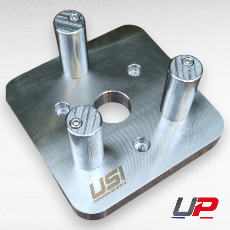 Conçu dans un acier adapté pour résister aux contraintes et aux frottements il est parfaitement ajusté avec ses trois plots excentriques d'une hauteur de 90 mm, cet outil permet de minimiser l'excentration des masses lors de l'emmanchement du maneton à la presse.